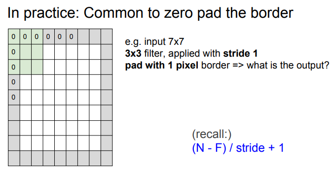 하나 더 봐야 할 것은 zero-padding! 코너의 값들이 적게 연산되는 것을 막아주고, 레이어들을 거치면서 입력의 사이즈가 줄어드는 것을 막아줍니다. 깊은 네트워크에서는 Activation map이 엄청나게 작아지게 되고, 이는 정보를 잃는 것이죠. 항상 원본 이미지를 표현하기에 충분한 차원을 사용해야 합니다.