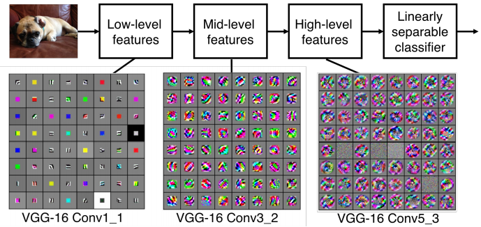 아래 그림과 같이 여러개의 conv layer을 거치면서 단순한 구조에서 더 복잡한 구조로 찾아감을 볼 수 있습니다. 각 그리드는 하나의 뉴런(필터)입니다.