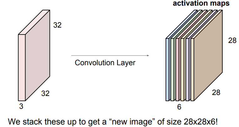 출력은 7x7x필터의 개수입니다. 각 필터가 입력의 모든 depth에 대해 내적을 수행한다(다시한번 필터의 depth는 input의 depth와 같다)