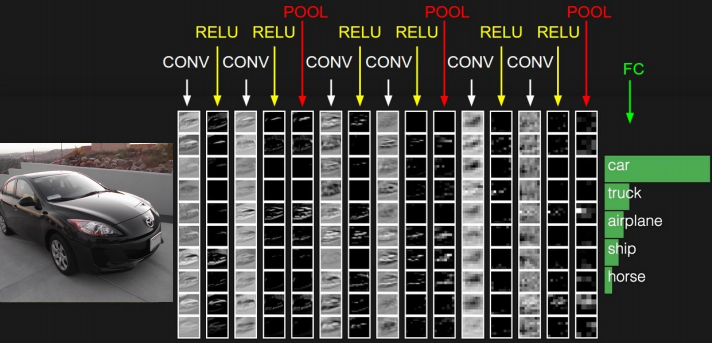 CNN의 전체적인 과정을 한 번 살펴봅시다.아래 그림과 같이 input 이미지는 여러 레이어들을 거치게 되고, 마지막에는 FC layer을 통해 스코어를 계산할 수 있습니다.