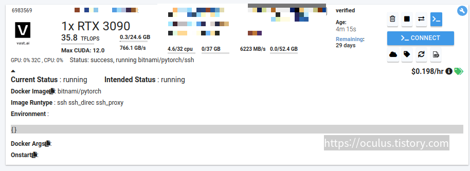 콘솔에서 원하는 gpu를 골라서 Rent를 누르면 대여가 시작된다. 사용중인 gpu는 instances 탭에서 볼 수 있다.