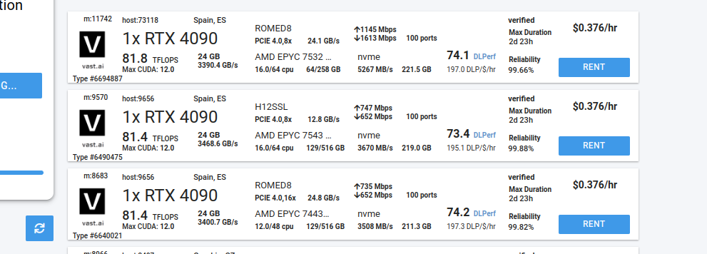 콘솔을 클릭하면 현재 대여 가능한 gpu들이 보인다. 같은 gpu라도 대여 개수와 flops에 따라 가격 책정이 달라진다.