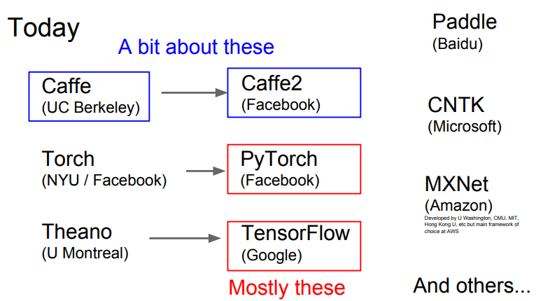 요즘 이용하는 딥러닝 프레임워크들은 아래와 같은 것들이 있고, 이 수업에서는 네모친것들만 다뤄보겠습니다.