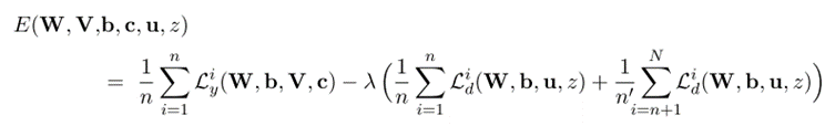 As you can see in the complete network figure below, the neural network (parameterized by W, b, V ,c) which is the main classification task on the source domain, and the domain regressor (parameterized by u, z) which helps to extract the feature that is independent with the domain, are computing in an adversarial way.
