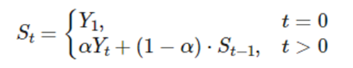 α가 0과 1사이의 값이고, Yt가 t번째의 input sample이라 하자. 이 low pass filter을 통과한 Output인 St는 다음과 같이 나타내어질 수 있다.