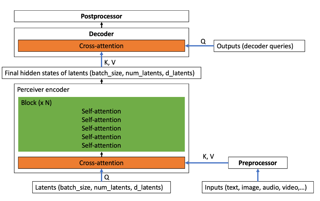 가장 먼저, input (any modality나 가능)은 필요시 Preprocessor을 통해 전처리가 된다. 다음으로, 전처리된 input은 Perceiver encoder의 latent variables와 함께 cross-attention을 수행한다. 여기서 latent variable은 Query를, 전처리된 input에서는 Key와 Value 값을 뽑는다. 그 후, Perceiver encoder는 여러개의 self-attention layer을 거치며 latent embedding을 업데이트 시킨다. Encoder는 (batch_size, num_latents, d_latents) 사이즈 텐서인 last hidden state를 반환한다. 그 다음 디코더는 latent의 final hidden state를 유용한 value로 decode 하는 역할을 한다. Cross-attention을 사용해서 수행이되고, latent는 key와 value로 trainable embedding은 query로 mapping하여 사용한다. 마지막으로 postprocessor는 decoder의 output을 특정 feature로 뽑아준다.