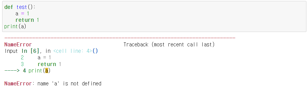 test 함수 내에 선언된 변수 a는 지역변수로써 함수밖에서 print를 하려해보니 정의되지 않았다는 오류가 뜹니다. 반면 전역변수의 경우를 보시죠.