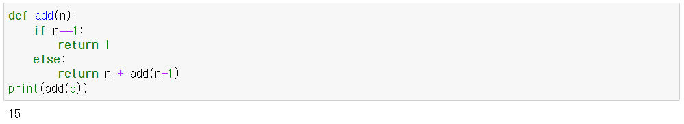결국 add 함수는 끝없이 안에 있는 add 함수를 불러오게 되는데, 이때 종료 조건으로 n이 1일때 1을 return해줌으로써 결과적으로 add(3)의 값을 계산할 수 있는 것이죠. 다른 예제도 살펴봅시다.