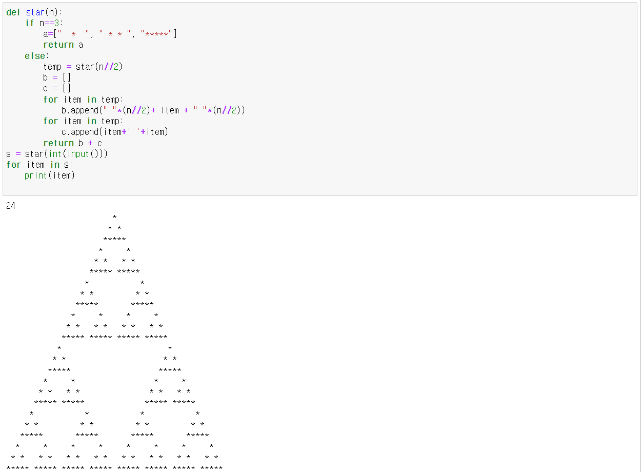 요 세줄의 조그만 세모를 가지고 다음 6줄의 세모를 만들기 위해서는, a를 쌓아야 되는데, 첫줄에는 양쪽에 (n//2)만큼의 공백으로 padding을 해주고, 두번째 줄에는 가운데에 공백만 추가해주면 됩니다. 즉, star(12)를 생각해보면,